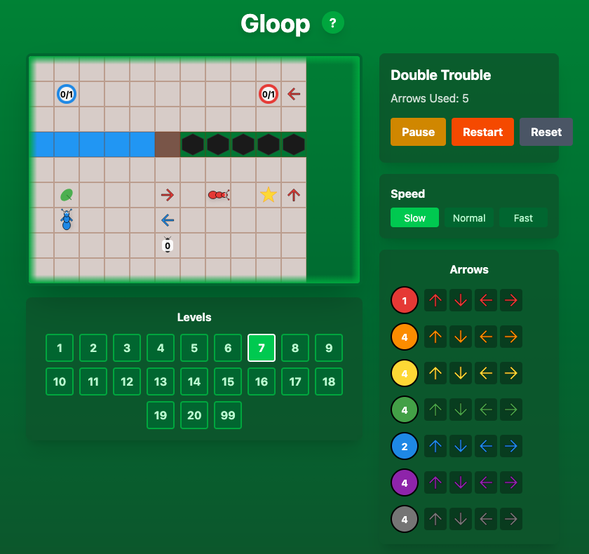 Gloops follow arrows matching their color, and can change colors by passing through color splotches, adding layers of strategic depth.