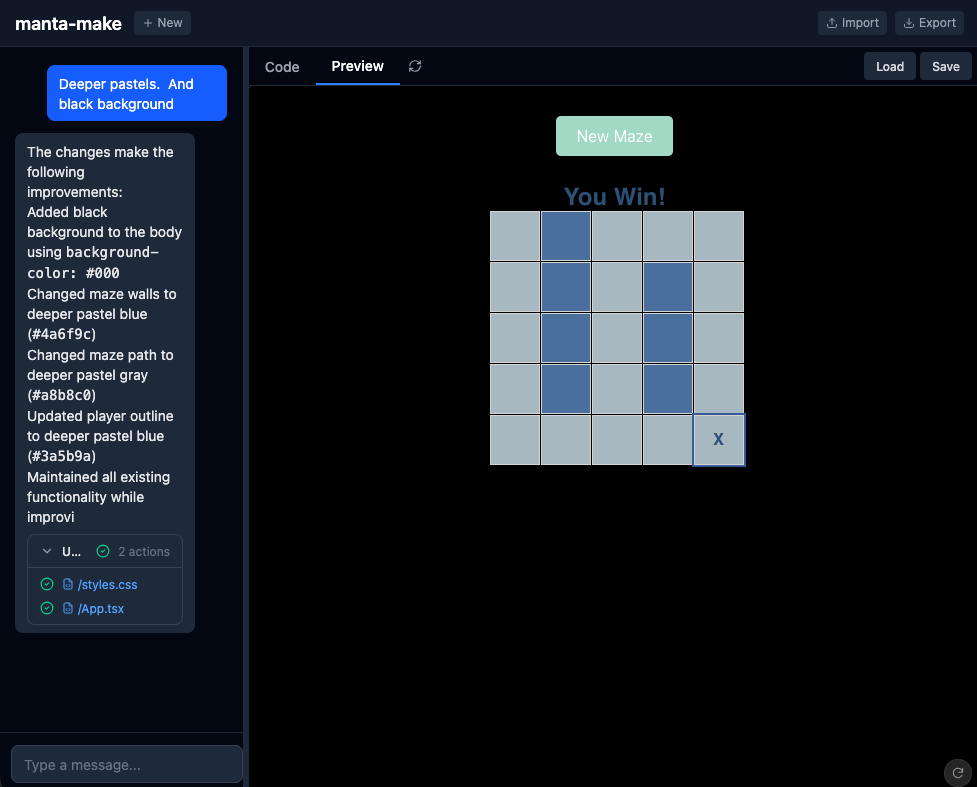 Manta Make is a browser-based development environment that pairs an AI chat assistant with a full code editor and live preview. Describe an application in plain English and the AI generates working React code, installs dependencies, and renders a live preview — all without leaving the browser.
