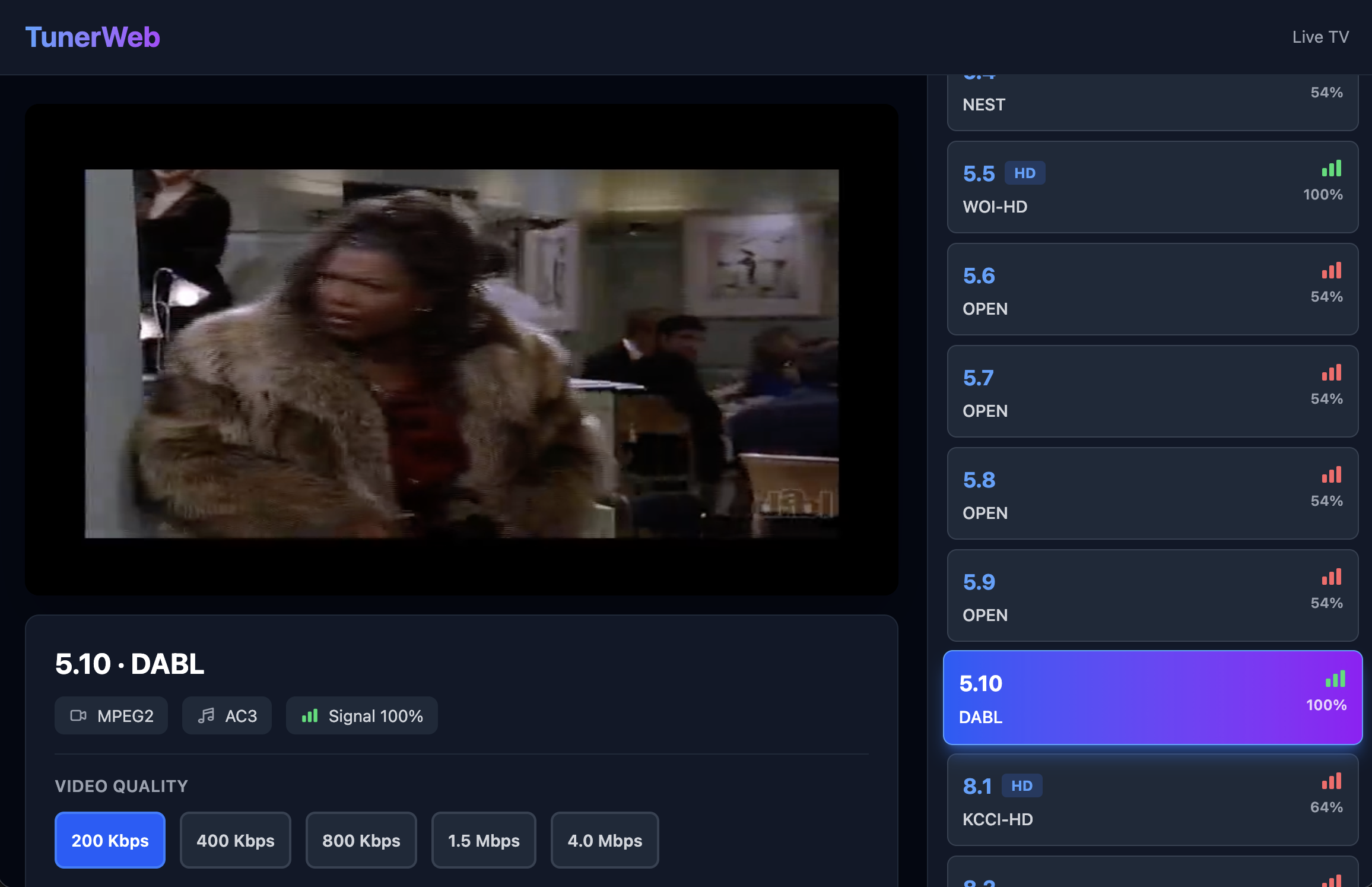 Perfect for cord-cutters who kept their cable subscription but ditched the expensive cable boxes. TunerWeb transcodes your HDHomeRun's MPEG-2 streams on-the-fly to browser-compatible HLS format, with adaptive quality selection for any connection speed.
